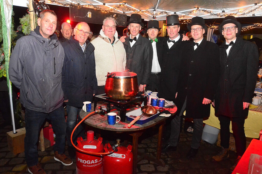 Freude gab es aber auch für das Organisatorentrio. Der fünfköpfige „Männerstammtisch“, der wieder stilvoll in Frack, mit Fliege und Zylinder Feuerzangenbowle servierte, versprach die Veranstaltung zu finanzieren. „Wir wollen nichts verdienen, sondern machen das hier ehrenamtlich. Letztes Jahr konnten wir den Bau der neuen Steganlage des Kanupolos mit 1.000 Euro und das Hobbyhorsing des Reitvereins mit 300 Euro bezuschussen. Als wir hörten, dass die freiwilligen Spenden beim Weihnachtsmarkt 2024 nicht die Ausgaben für Versicherungen, Genehmigungen oder auch die Hüpfburg deckten, entschlossen wir uns, die Finanzierung zu übernehmen“, hieß es.
