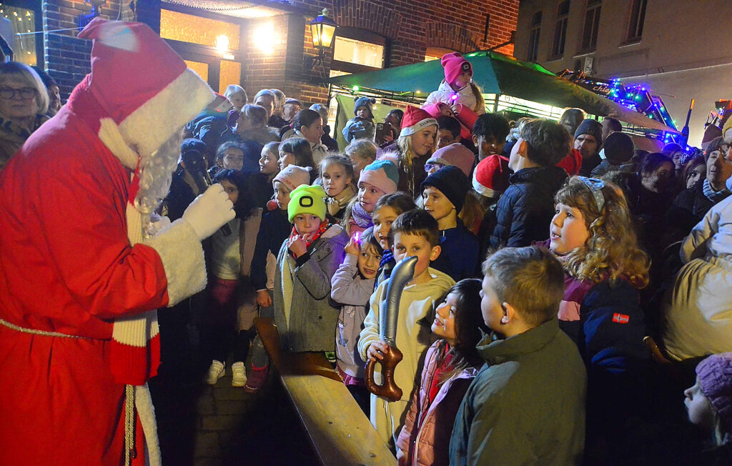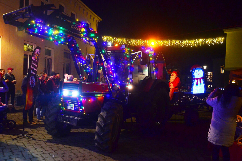 Zur Nebensache bei den Kindern wurde die große Hüpfburg schließlich, als der Weihnachtsmann im Hänger eines bunt beleuchteten Treckers anreiste. Rund 100 Tüten hatten die Organisatoren im Vorfeld gepackt, die der Rotrock gerne gegen ein kleines Gedicht oder Lied an die Jungen und Mädchen verschenkte.
