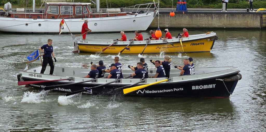 Dabei gingen immer zwei Mannschaften an Bord der beiden Kutter „Brommy“ und „Fregatte“. Teilweise fegten die Mannschaften mit einer beeindruckenden Geschwindigkeit durch den Binnenhafen. Nach der Hälfte der rund 400 bis 250 Meter langen Strecke galt es eine gelbe Wendetonne zu umrunden und wieder zum Ziel zurückzukehren. . Mit dem Zieleinlauf musste der Steuermann mit der Hand an der Pinne die herabhängende Zielboje der zugewiesenen Bahn -für den Starter sichtbar- anschlagen, dann erst wurde die Zeit genommen.