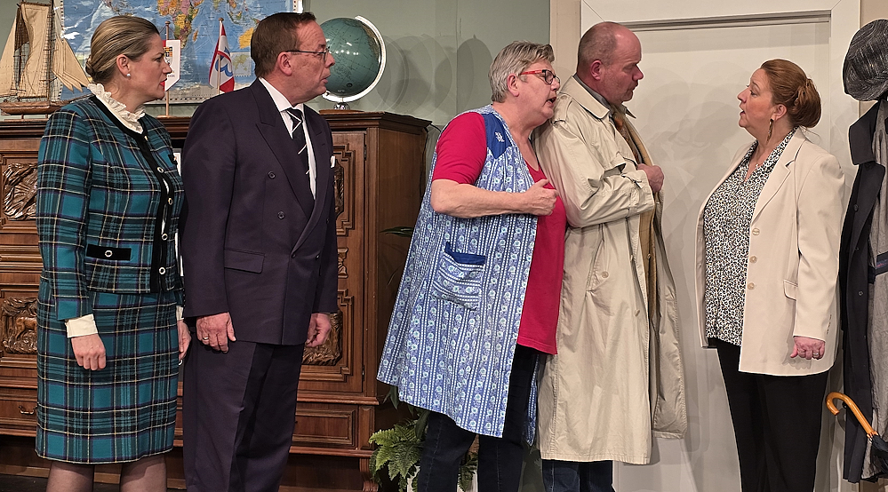 Reinigungskraft Erna Pieper (Dagmar Heeren-Schenk), Hauptkommissar Willi Brockmann (Alexander Oetken), Kriminalassistent Waldemar-Ewald Schulz (Holger Wedeken), Reeder Richard Henning (Michael Haaken), Richards Ehefrau Ingeborg Henning (Simone Feige), Richards Privatsekretärin Ulla Gerdes (Katja Wöhler), Prokurist Robert Westfal (Rainer Büsing) und die Angestellte Erika Reinhold (Sarah Harms). Aber auch ein begehbarer Schrank spielt eine wichtige Rolle in dem Stück.