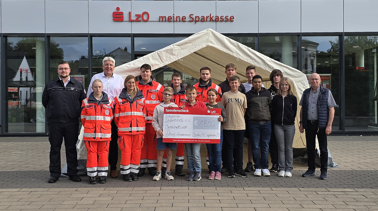 Andreas Vollert, Regionaldirektor Privatkunden der LzO in der Wesermarsch und Norbert Ostendorf vom Stiftungsrat der Landessparkasse zu Oldenburg (LzO) überreichten Thorge Schmidt und der Jugendleiterin Daniela Wiesiolek vom den Johannitern, Ortsverein Stedingen, Helferschaft Brake, einen symbolischen Scheck in Höhe von 1.800 Euro.