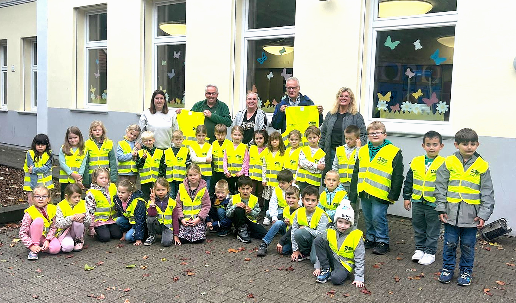 Foto: Verkehrswacht – Die Erstklässler mit den Lehr-/Aufsichtskräften sowie Geschäftsführer Klaus Lücke (hintere Reihe 2. v. r.) und Jörg Stührenberg (hintere Reihe 2. v. l.) zeigt.