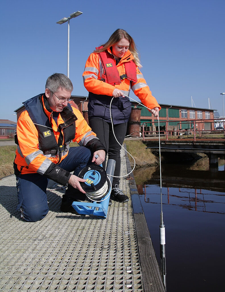 Titelfoto: Ziegeler/NPorts – Martina Ritter und Carsten Didi nehmen eine Wasserprobe in Emden – zu Demonstrationszwecken nicht vom Boot, sondern vom Steg aus.