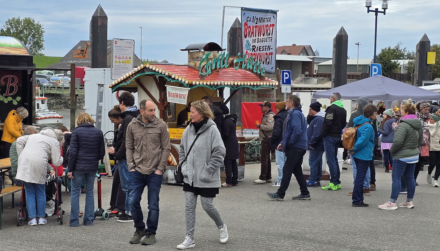 Auch die Gaumenfreuden kamen hier nicht zu kurz. Selbstverständlich gab es Fischprodukte, aber auch einen halben Meter Bratwurst im Brötchen, Crêpes, Pommes und vieles mehr. Neu in diesem Jahr war ein Stand mit Wildfleisch und hier insbesondere Wildsalami sowie der Stand Friesenflair mit eigenen Bränden.
