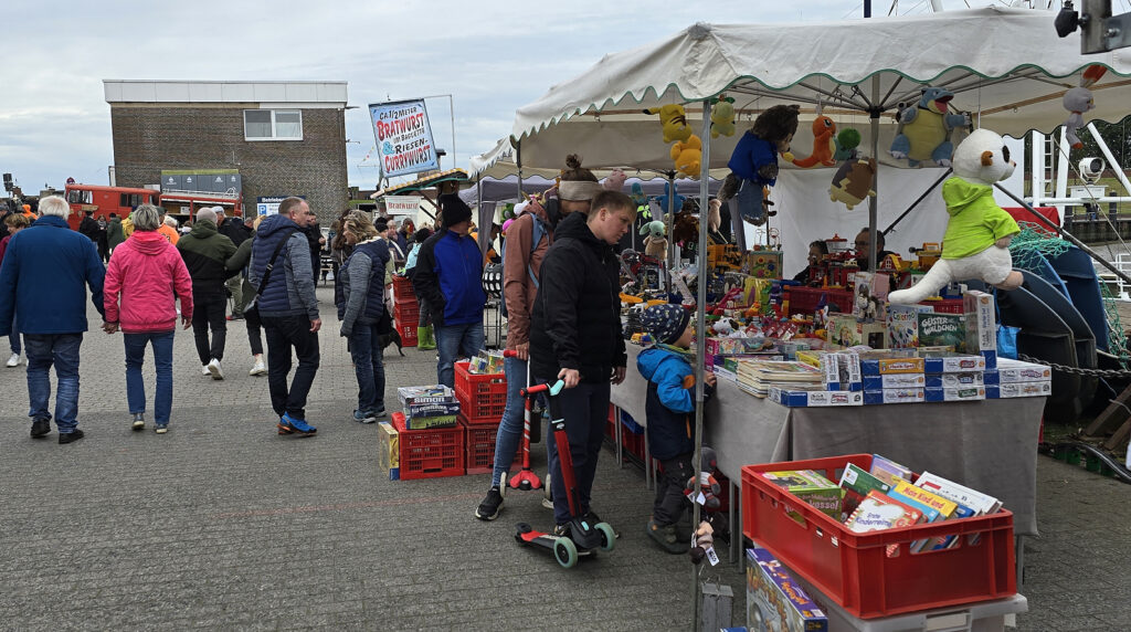 Schneller wäre es bei sommerlichen Temperaturen gegangen. „Dann hätten sich die Bieter, wie in den Jahren zuvor, sicher wieder gegenseitig überboten“, meinte Claudio Schrock-Opitz, Geschäftsführer des Tourismus-Service Butjadingen. Während es sich die Gäste an den Ständen rund um das Hafenbecken gut gehen ließen, unternahmen Claudio Schrock-Opitz und sein Team bereits erste Vorbereitungen, sich auf die Sturmflut, in der Nacht von Sonnabend auf Sonntag vorzubereiten. Alle Mitarbeitenden wurden aus dem Urlaub geholt und Diejenigen informiert, die Wohnwagen auf dem Campingplatz stehen haben. Dort herrschte ebenfalls rege Betriebsamkeit, denn die Prognose für die Sturmflut lautet, dass am Sonntagmittag das Wasser 1,5 bis 2 Meter über das Hafengelände schwappt. „Sonntag kann hier keiner mehr herumlaufen“, sagt Claudio Schrock-Opitz, „Aber mit vereinten Kräften schaffen wir das.“ (Fotos und Text: Kerstin Seeland)