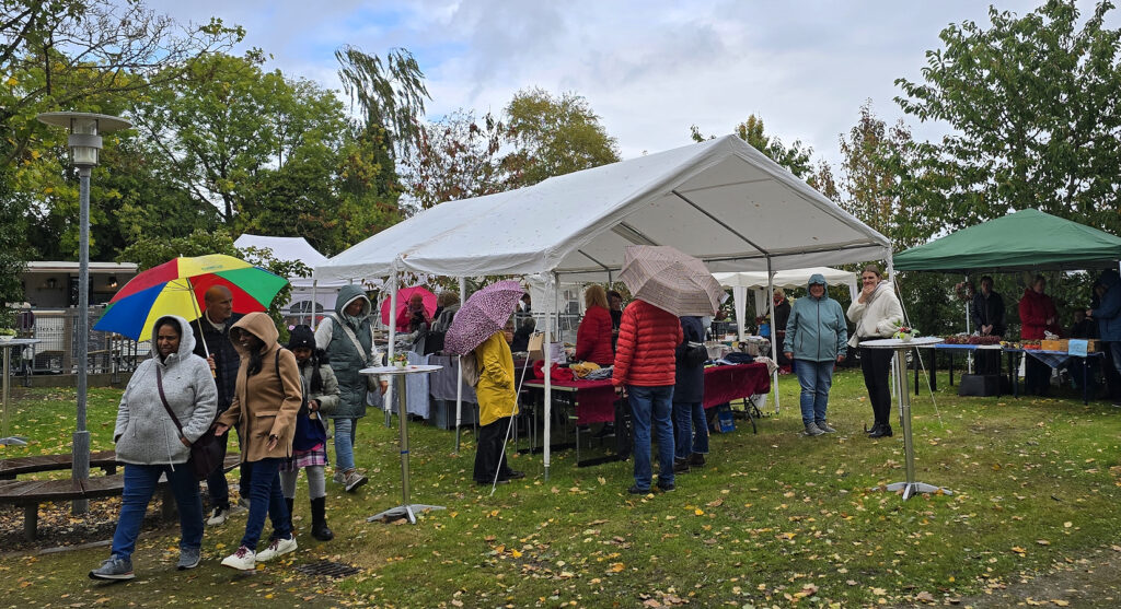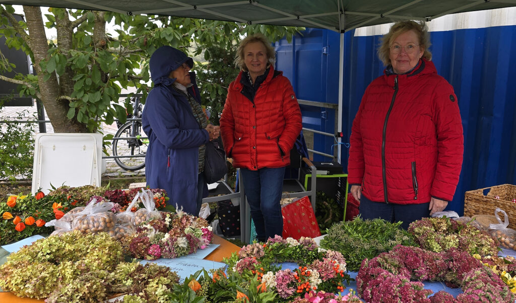 So konnten die Besucher hier neben regionalen Köstlichkeiten wie Käse, Marmelade, Liköre, Kuchen, handgefertigte Pralinen, Naturseifen, Schmuck, fair trade-Waren, hübsch gestaltete Herbstkränze, Gin-Spezialitäten von Moorriem, Keramikgeschirr sowie selbst genähte Kleidung, Taschen und Behälter aus Stoff, auswählen. Dekoratives und auch Gedrechseltes aus Holz wurde angeboten, und die Schatzkiste aus Elsfleth hatte Kleidung und mehr aus zweiter Hand dabei.