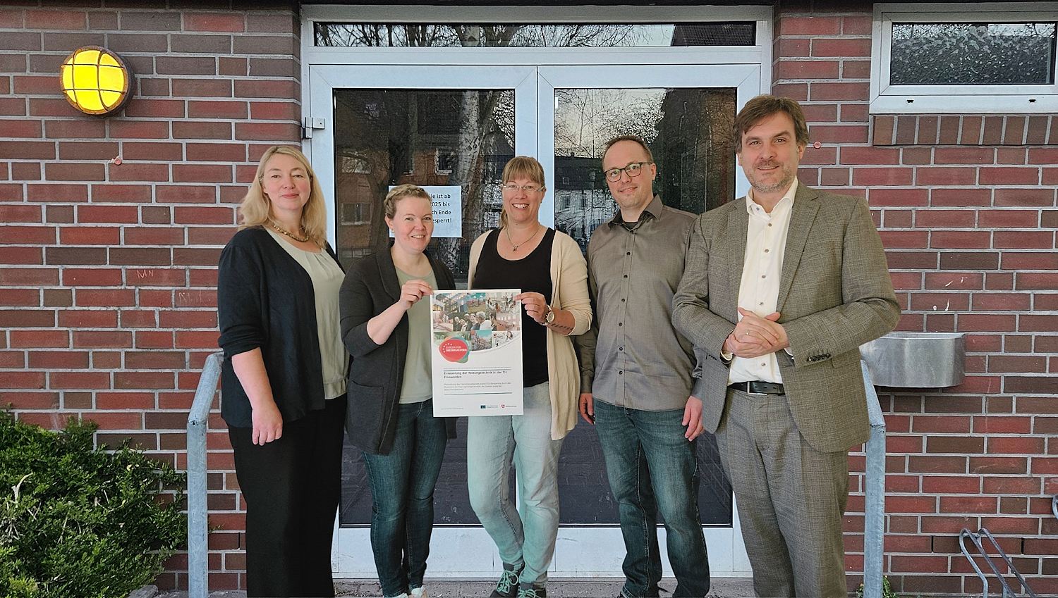 Titelfoto: Freuen sich über den Förderbescheid für die Turnhalle Einswarden: (v.l.) Baudezernentin Maike Schilling, Ronja Frerichs und Rebecca Willuhn (beide städtische Förderstelle), Leiter des Bauverwaltungsamts Tim Kaspers und Bürgermeister Nils Siemen (pm/lr – Foto: Stadt Nordenham)