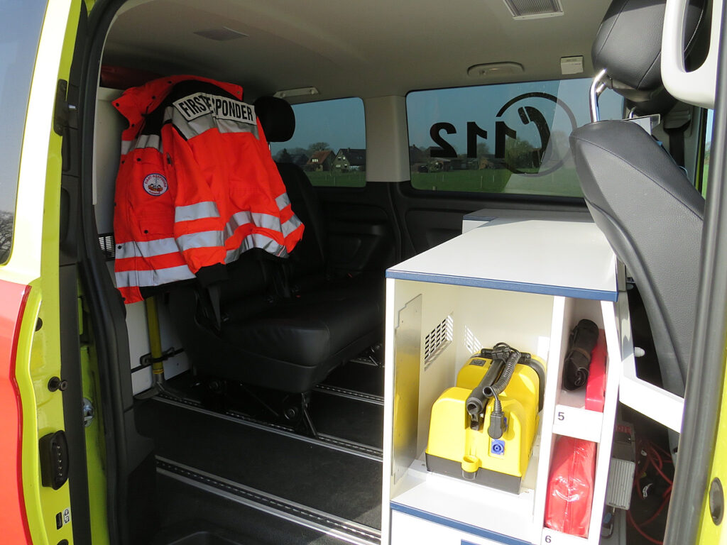 Das neue First Responder Fahrzeug (kurz FRF) ist mit einer Blaulichtanlage inklusive Umfeldbeleuchtung, Funkgeräten, Einsatzstellenbeleuchtung, Halligan-Tool, Verkehrsabsicherungsmaterial und natürlich mit medizinischem Material wie einem Defibrillator, Sauerstoff- und Beatmungszubehör, Messgeräten zur Diagnostik, Infusionen, elektrischer Absaugpumpe sowie Materialien für Kindernotfälle und besonderen chirurgischen Notfällen ausgestattet.