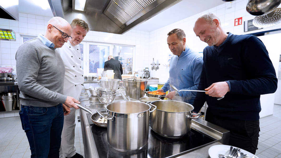 Dass all die Theorie zwischen dampfenden Töpfen, heißen Pfannen und gefüllten Speiseplatten noch Platz findet, beeindruckt alle Beteiligten. „Wer hätte gedacht, dass wir jemals zusammen am Herd stehen?“, bemerkte Thomas Elsner (Vorstandsvorsitzender) ins Rund, „aber ich muss sagen: tolle Truppe!“ Und tatsächlich hätten wohl weder die Küchenkräfte selbst noch Thore Wintermann (Vorstand Verband und Politik) und Christoph Fehringer (kaufmännischer Vorstand) jemals vermutet, gemeinsam Zwiebeln zu schneiden und Möhren zu hacken … Klar, nicht jeder bringt da möglicherweise das gleiche Geschick am Löffel an den Tag, aber wie im Pflegealltag, so auch in der Küche: Man hilft sich gegenseitig!