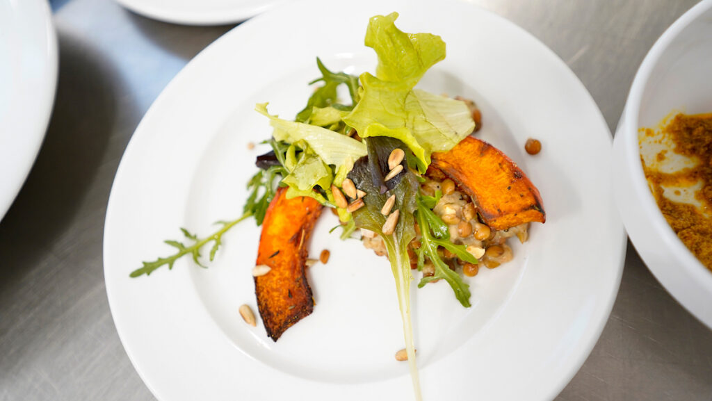 Grüner Frischkäse, Süßkartoffel-Karotten-Suppe, Saisonaler Gemüsestrudel oder Klopse „Königsberger Art“ mit Grünkern und Kapernsoße – Rezepte, die bislang noch nicht den Weg zur Umsetzung so wie heute und hier fanden, hat Martin Horn mitgebracht. Er ist Fachkoordinator der AWO Potsdam, leitet selbst die Küche mehrerer Seniorenzentren ebenda, und hat zusammen mit Thomas Diekamp (Projektleiter und Referent für Klimaschutz Qualitätsmanagement und Nachhaltigkeit der AWO) sowie Ökotrophologin Saskia Wendt („KLUG“ – Die Deutsche Allianz Klimawandel und Gesundheit) den Teilnehmenden aus Einrichtungen zwischen Nordsee und Osnabrücker Land ganz praktisch das Konzept „KidZ“ vorgestellt.