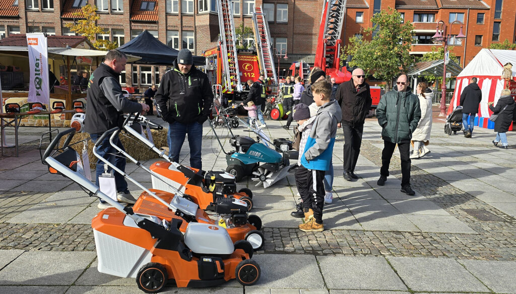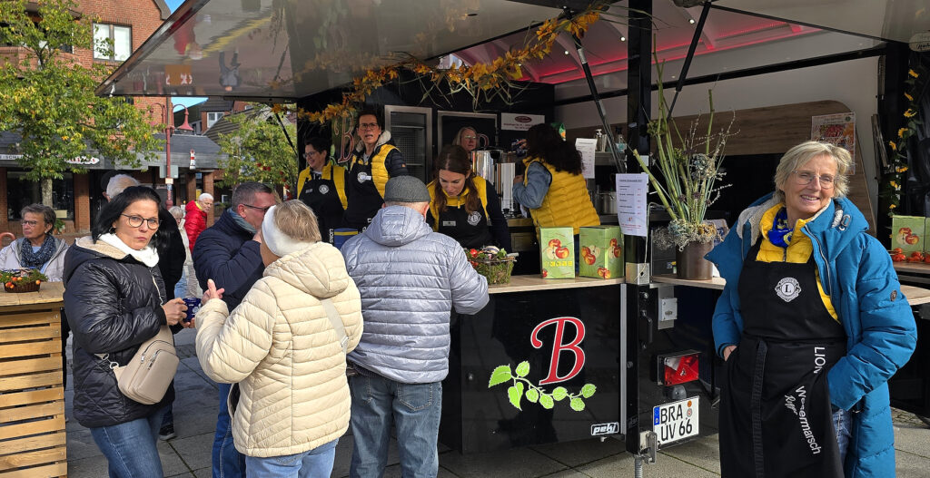 Ein paar Schritte weiter auf der Servicemeile hatten der Lions Club Wesermarsch „Emy Rogge“ seinen Verkaufstand. Hier gab es frischen Apfelsaft. Sie hatten zuvor Mengen von Äpfeln gesammelt und gepflückt und diese dann von der Umweltstation Iffens zu leckerem Saft verarbeiten lassen. Auch heißer Apfelsaft wurde an diesem Sonntag gerne probiert. Das Wetter meinte es sehr gut mit dem Organisationsteam von Nordenham Marketing & Touristik, und die Sonne gab noch einmal alles. Dennoch waren die Temperaturen gerade noch so im zweistelligen Bereich. Da kam so ein heißer Becher Emys Apfelzauber gerade recht. Auch die Erlöse des Damen Lions-Clubs fließen der „Tafel“ zu.