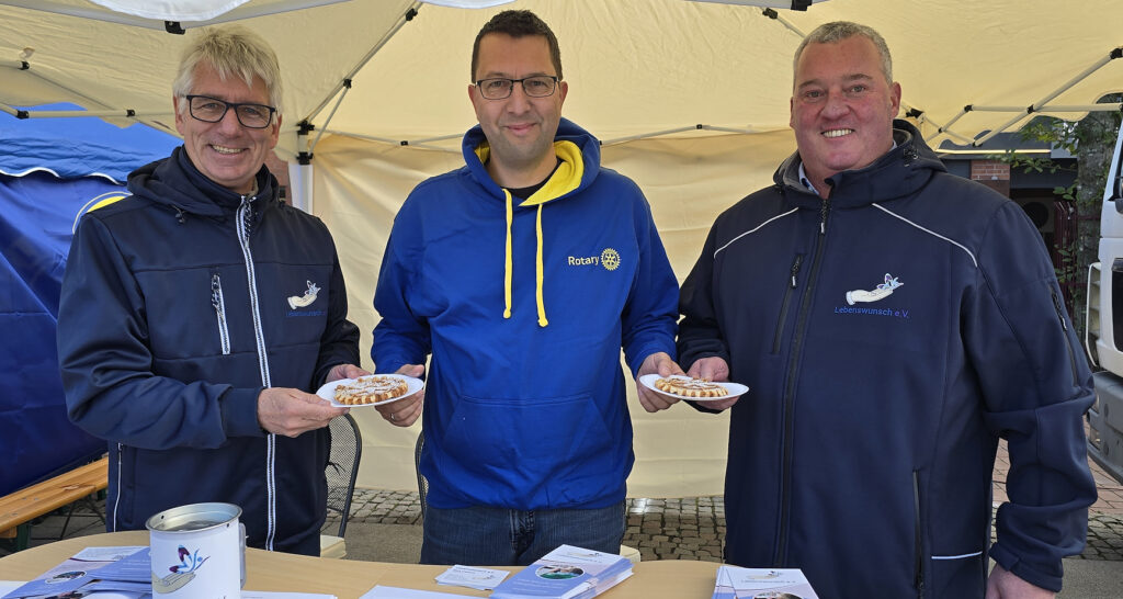 Gerade trägt Marco Schnakenberg vom Rotary Club Nordenham zwei frisch gebackene Rotary-Waffel-Symbole einen Stand weiter, zu Michael Kurz und Mark Castens vom Verein Lebenswunsch. Die Beiden informieren über die Arbeit des Vereines, die Wünsche für Sterbenskranke erfüllen.