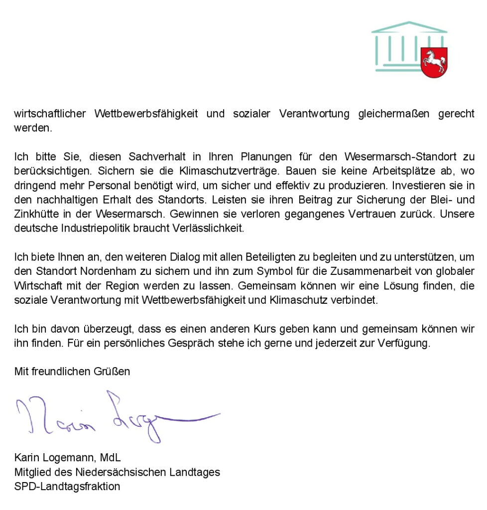 Nordenham – Schreiben von MdL Karin Logemann (SPD) an Gary Nagle, den CEO von Glencore
