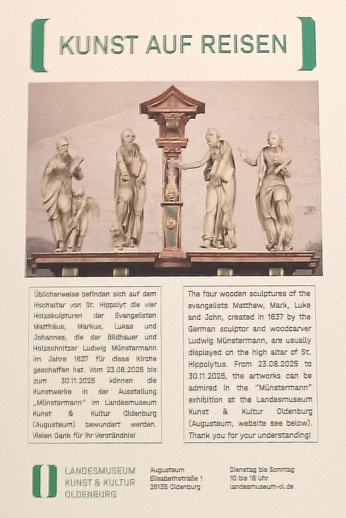 Auch die Kirchengemeine Blexen ist in ihrer St.-Hippolyt-Kirche mit Kanzel, Altar und Fürstenstuhl mit zahlreichen Werken aus der Hand des Ausnahme-Bildhauers ausgestattet. Auf Anfrage des Landesmueums erklärte sich der Gemeindekirchenrat bereit, die vier Evangelisten des Altars für die Ausstellung zur Verfügung zu stellen. Am Dienstag, 12. August 2025 wurden die Figuren nun von Fachleuten mit Hilfe eines Gerüstes von den Höhen des Altares herunter geholt und sorgfältig verpackt. In der hauseigenen Werkstatt des Restaurators werden sie nun gründlich gereinigt und dann in der Ausstellung präsentiert.