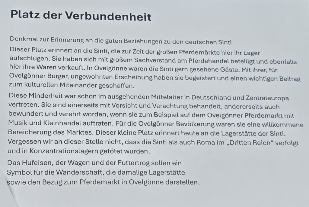 Die neue Tafel erklärt die historische und kulturelle Bedeutung des Denkmals, das aus einem Hufeisen und einem Wagen mit Pferd besteht. Während das Hufeisen für den Pferdemarkt, den Pferdehandel und die Expertise der Sinti steht, symbolisiert der Wagen die Reisen und Herausforderungen, die die Sinti auf sich genommen haben, um aktiv am gesellschaftlichen Leben teilzunehmen. Viele Passanten vermuteten bislang, die Objekte gehörten zur Reithalle – die Infotafel schafft nun Klarheit und lädt zum Nachdenken ein.