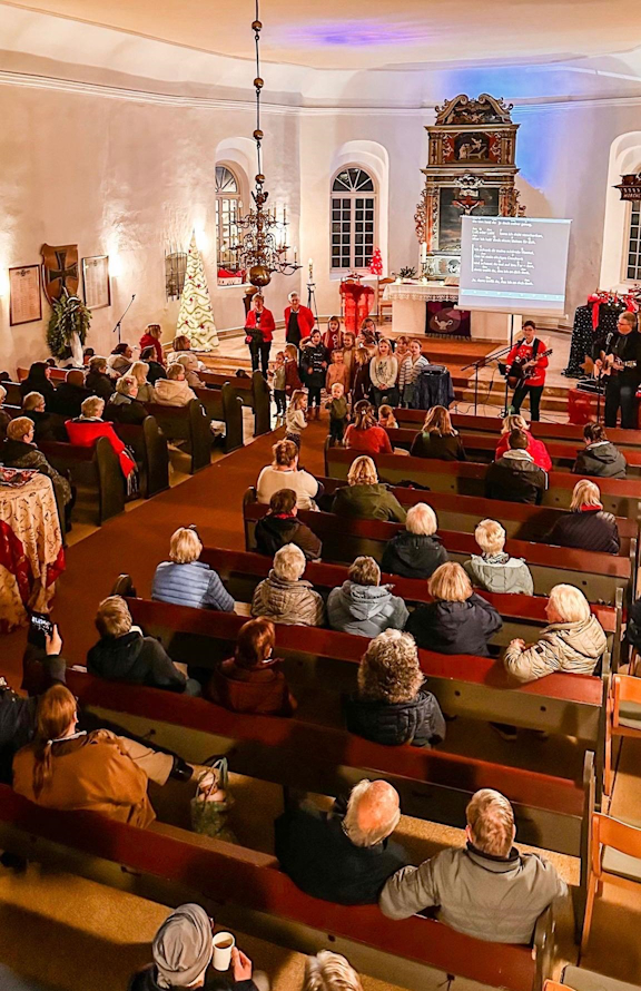 Am Freitag, 5. Dezember 2025, verwandelte sich die Christuskirche in Oldenbrok in einen großen Weihnachts-Chorraum. Die Band „SingBrise“, unter der Leitung von Inse Böning, hatte zu einem gemeinsamen Adventslieder-Singen eingeladen. Damit auch alle die Lieder gut mitsingen konnten, wurden die Texte auf eine große Leinwand projiziert.