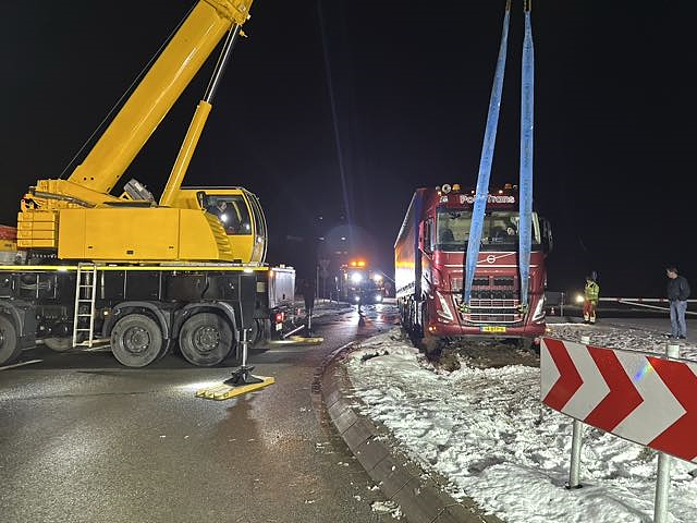 Ein 53-Jähriger befährt mit seinem Sattelzug die Bundesstraße 211 in Richtung Brake. Bei winterlichen Straßenverhältnissen kommt er im Kreisverkehr von der Fahrbahn ab und rutscht mit seinem Fahrzeuggespann in die Innenfläche des Kreisverkehrs.