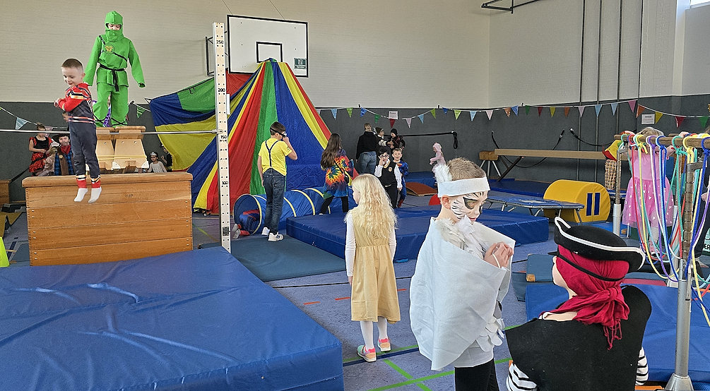 Ein Indoor-Spielparadies erwartete die Kinder, die am Sonntagnachmittag beim Kinderkarneval die Turnhalle in Großenmeer betraten. Der Förderverein der Grundschule hatte dort mittels einer Vielzahl von Sportgeräten zahlreiche Spiel-, Kletter- und Tanzmöglichkeiten geschaffen, um den Kindern für zwei Stunden eine tolle Zeit zu bereiten. Mit jeder Menge Luftballons, bunten Wimpelketten und Superhelden war die Turnhalle in eine Partylocation verwandelt worden.