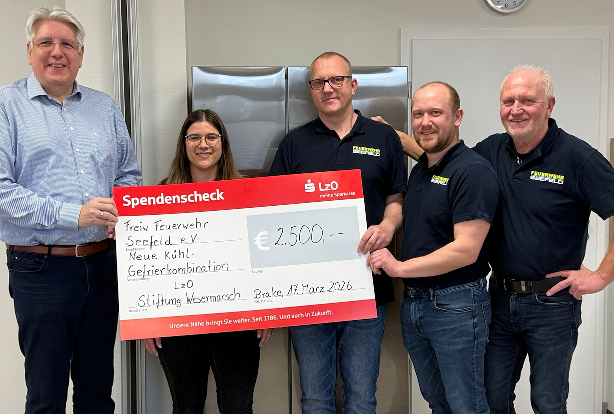 Ein weiterer Höhepunkt des Tages war die Spendenübergabe durch die Landessparkasse zu Oldenburg (LzO). Andreas Vollert, Direktor Wesermarsch, überreichte der Feuerwehr Seefeld eine Spende in Form einer Kühl- und Gefrierkombination. Diese ist speziell für die Blutspendeaktionen vorgesehen und ermöglicht künftig eine optimale Kühlung und Lagerung von Getränken und Speisen für alle Teilnehmenden.