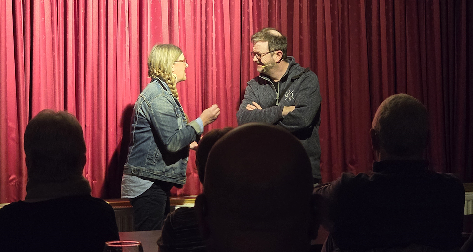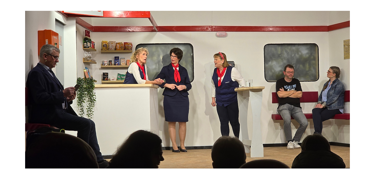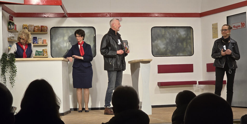 Vor vollbesetztem Saal ging es nach dem Sektempfang gleich los zum Interlux-Express in Richtung „Champus“. An Bord des Zugs jede Menge illustre Gäste. Unter ihnen auch das Paar Kati (Beate Arens) und Rudolf (Jörg Meyer), die auch endlich im Zug angekommen sind. Die Beiden haben an diesem Tag noch Besonderes vor. Schauplatz des Ganzen: das Bistro im Zug, in dem es überaus „freundliches“ Personal und dazu noch lauwarme Speisen gibt.