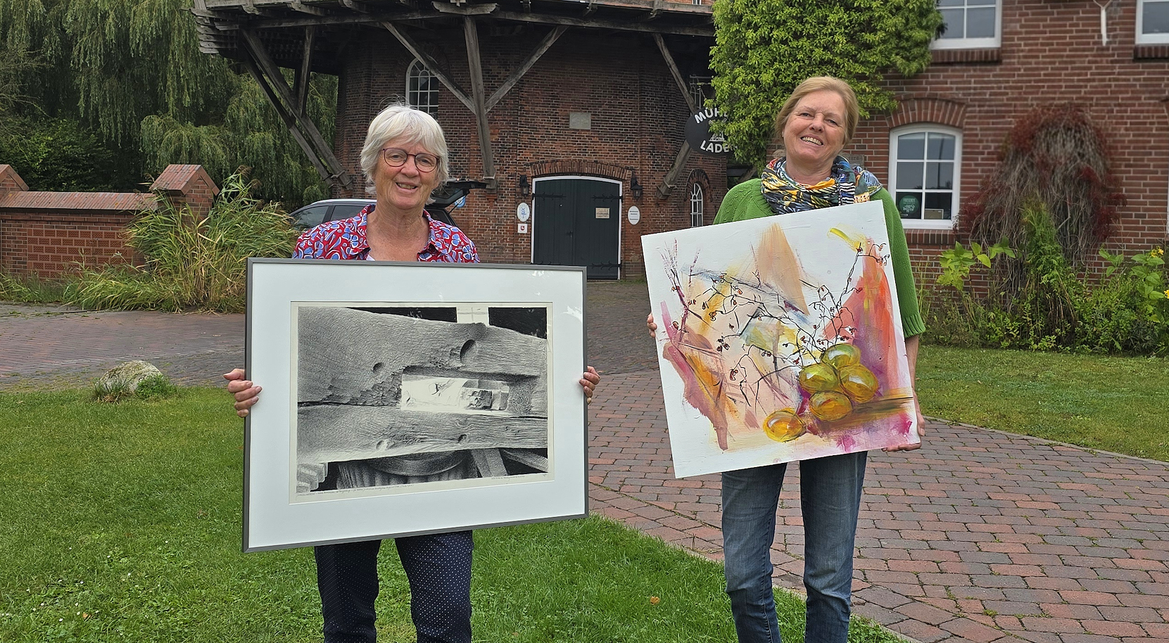 Titelfoto: Cornelia Iber-Rebentisch und Meike Janßen präsentieren Lieblingsbilder vor der Mühle
