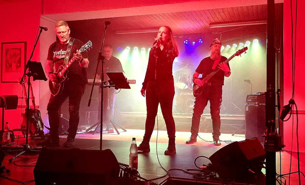 Ramona Schütte dankte den Sponsoren, ohne deren Unterstützung das kleine Festival nicht stattfinden könnte und auch an all die Helfer. „Wir wollen heute Abend Spaß haben und den Kopf frei bekommen“, meinte sie. Einen weiteren Dank schickte sie an die Bands, die gemeinsam mit EO IPSO an diesem Abend auf der Bühne standen. „Auch wenn KI so vieles möglich macht, Live-Musik ist doch einfach das Beste.“ Und damit traf sie genau den Nerv des Publikums, das an diesem Abend zum Musikhören und Feiern erschienen war. Unter den Gästen waren auch drei Herren, die extra aus Oldenburg angereist waren. „Wir sind heute schon zum zweiten Mal hier, weil uns die Musik gut gefällt und auch, weil es ein kleines Festival ist“, meinte die Drei unisono.
