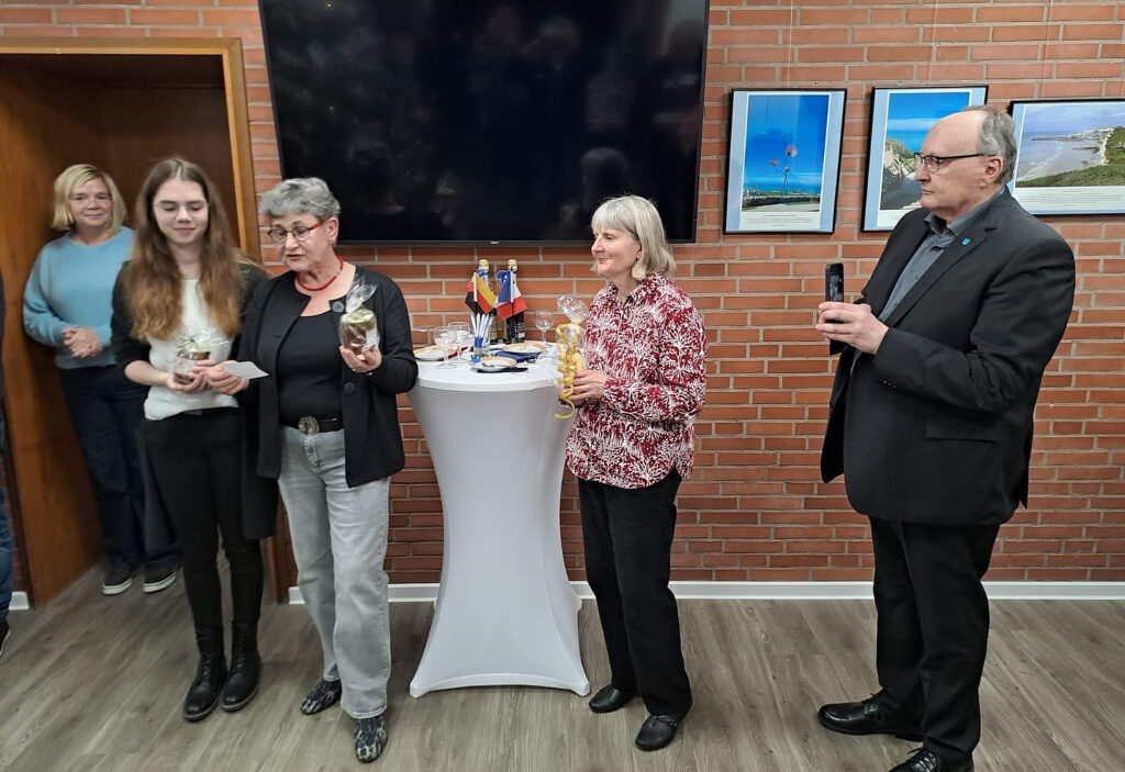 Die kulinarischen Köstlichkeiten, die gereicht werden, sind von Mitgliedern des Freundeskreises Petit-Caux gespendet worden. Neben französischen Cidre wurden auch alkoholfreie Getränke gereicht. (Text: Kerstin Seeland)