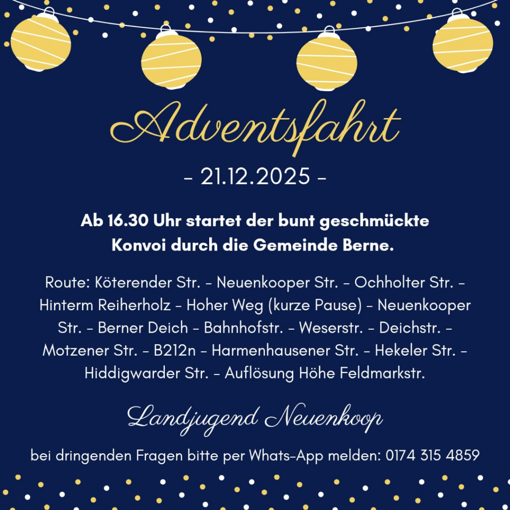 Berne – Landjugend Neuenkoop startet am Sonntag, 21. Dezember 2025, die Adventsfahrt