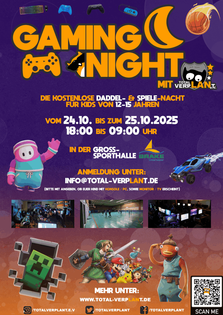 Am letzten Oktober-Wochenende findet von Freitag, dem 24. Oktober, um 18 Uhr bis Samstag, dem 25. Oktober 2025, um 9 Uhr die „GAMING NIGHT“ für Kids im Alter von 12 bis 15 Jahren statt. Die Veranstaltung ist kostenlos und beinhaltet neben dem eigentlichen Event auch ein Frühstück am Samstagmorgen sowie Snacks für zwischendurch. Wer keinen PC zur Verfügung hat, darf gerne mit einer eigenen Spielekonsole teilnehmen. Auf der GAMING NIGHT werden ausschließlich Spiele mit entsprechender USK-Altersfreigabe gespielt, zum Beispiel EA FC, Fortnite, Minecraft, Mario Kart und viele mehr. Interessierte können sich per E-Mail an info@total-verplant.de anmelden. (pm/lr)