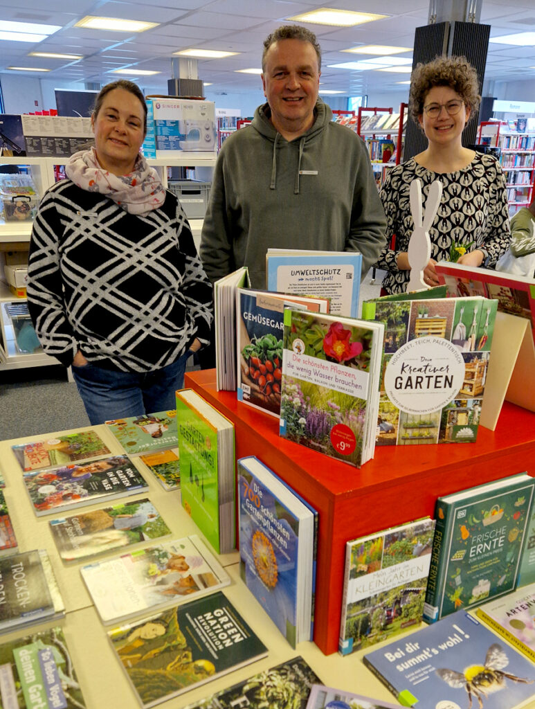 Titelfoto: Anne Humboldt (Mitte) und Inga Lüdke vom Team der Kreisbibliothek laden zur Pflanzentauschbörse ein. Diesmal wird Sönke Hofmann vom Klimaschutzmanagement des Landkreises einen Fachvortrag halten.
