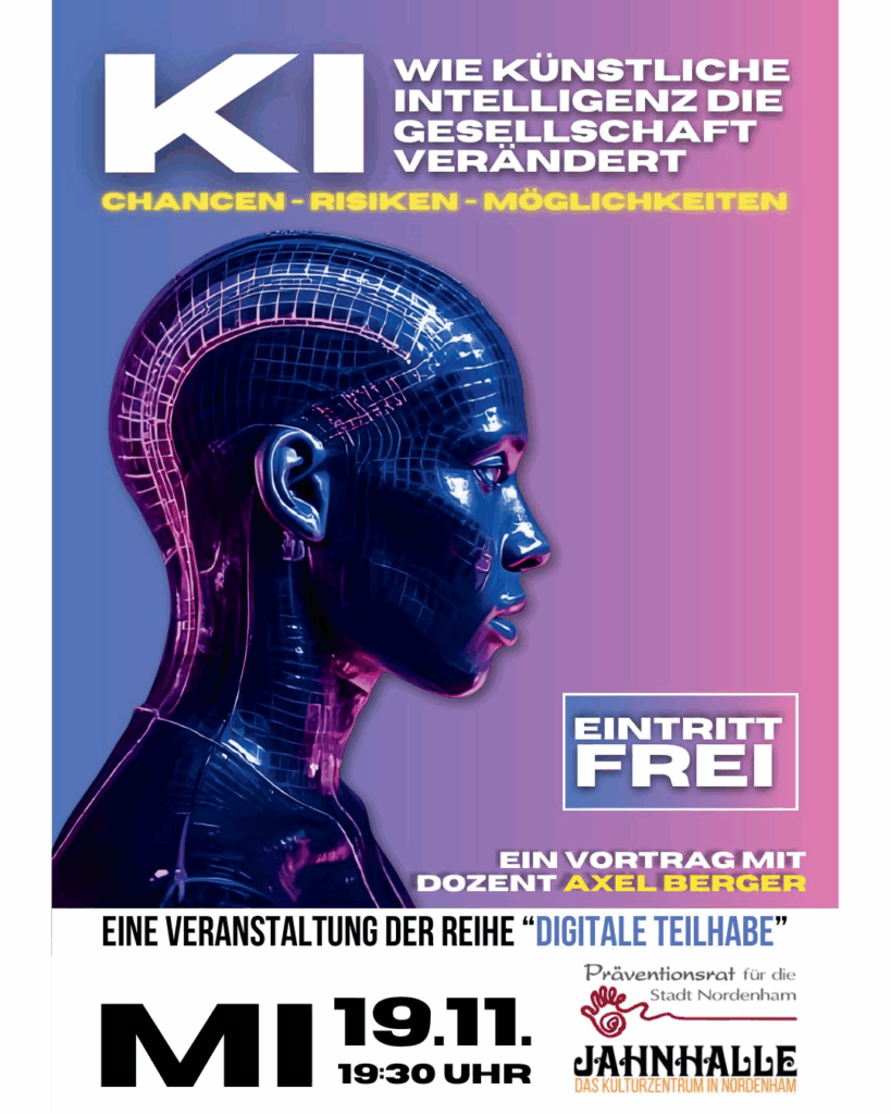 Unter dem Titel „Chancen – Risiken – Möglichkeiten“ beleuchtet Dozent Axel Berger, wie Künstliche Intelligenz (KI) unseren Alltag, die Gesellschaft – und vielleicht auch uns selbst – verändert.