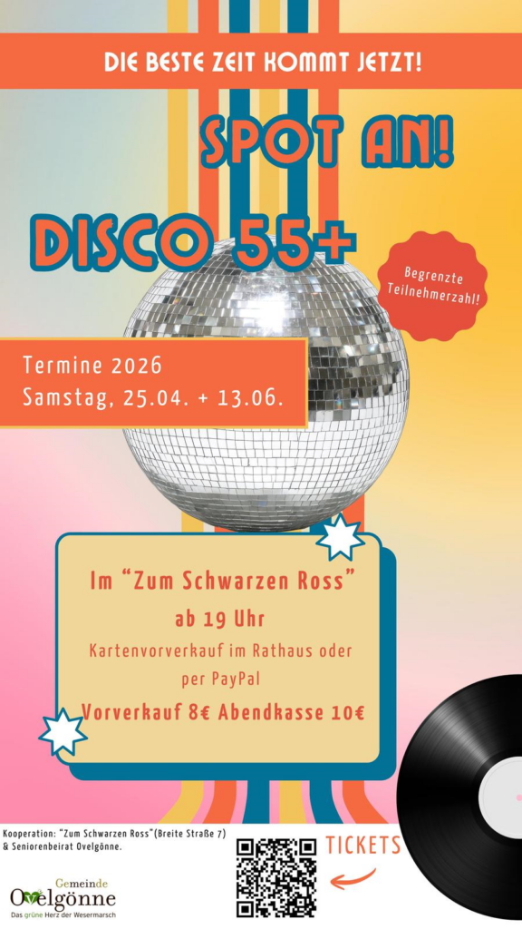 Die Gemeinde Ovelgönne setzt einen besonderen Wunsch aus der Bevölkerung um: Gemeinsam mit dem Seniorenbeirat der Gemeinde und der Gaststätte „Zum Schwarzen Ross“ wird eine Disco für Menschen 55+ organisiert. Holt also die Paillettenshirts und Schlaghosen aus dem Schrank, schmeißt euch in schicke Outfits der Disco-Zeit und genießt den Abend.