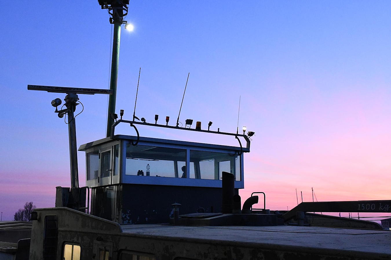 kleineren Abteil die Kammer eines Matrosen. Der Steuerstand eines Binnenschiffes ist auf einem