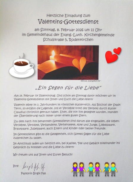 Die ev.-luth. Kirchengemeinde Rodenkirchen lädt am Sonntag, 8. Februar 2026, 11 Uhr, zum Valentins-Gottesdienst mit anschließendem Kaffeetrinken in das Gemeindehaus in Rodenkirchen, Schulstraße 5, ein. (pm/lr)