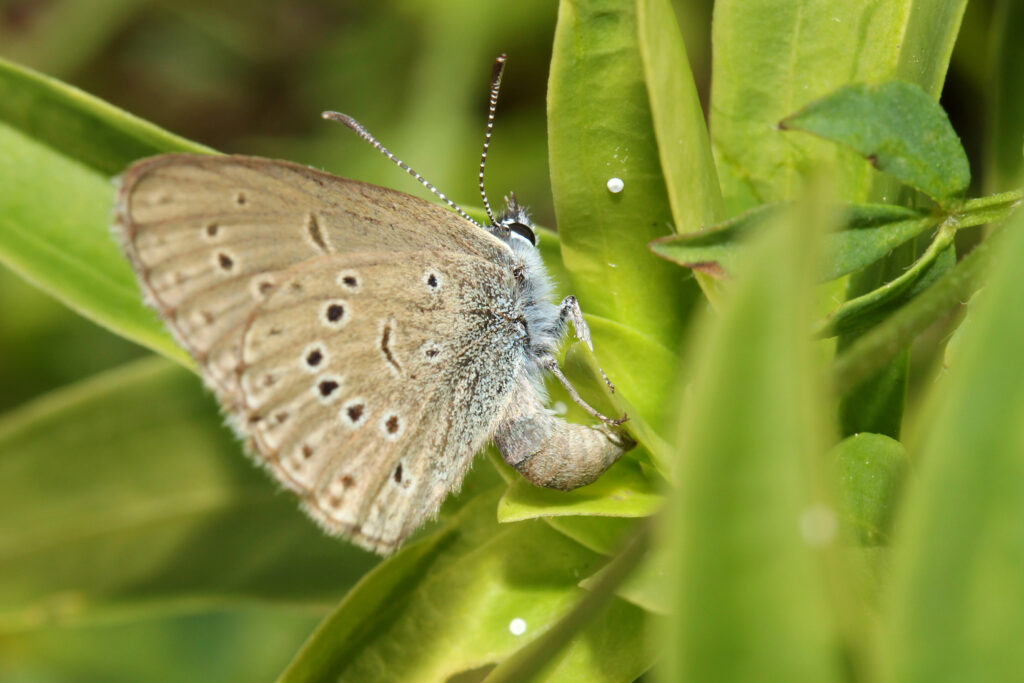 Ein gutes Beispiel für die komplexen Wechselwirkungen und zugleich ein besonders bemerkenswerter Fund war der Nachweis des stark gefährdeten „Kreuzenzian-Ameisenbläulings“, der mit fünf Individuen und rund 65 Eiern 2024 am Burgberg gesichtet wurde. Diese Art bevorzugt als Lebensraum den Halbtrockenrasen. Seine Entwicklung ist eng mit dem Kreuzenzian und Knotenameisen verknüpft. Die Raupen des Enzian-Ameisenbläulings nutzen den bitteren Kreuzenzian als Nahrungspflanze und legen ihre Eier an dessen Blüte ab. Nach mehreren Häutungen lassen sich die jungen Larven zu Boden fallen und warten dort darauf, von einer bestimmten Knotenameise in deren Nest getragen zu werden. Hier imitieren sie chemisch und akustisch die Ameisenlarven und werden wie eine Ameisenkönigin versorgt – bis sie schlüpfen. „Dann müssen sie das Nest rasch verlassen, da ihre Tarnung nun nicht mehr funktioniert. Damit der Enzian-Ameisenbläuling überleben kann, ist das Verständnis dieser Wechselwirkungen unerlässlich“, betont Wellmann.
