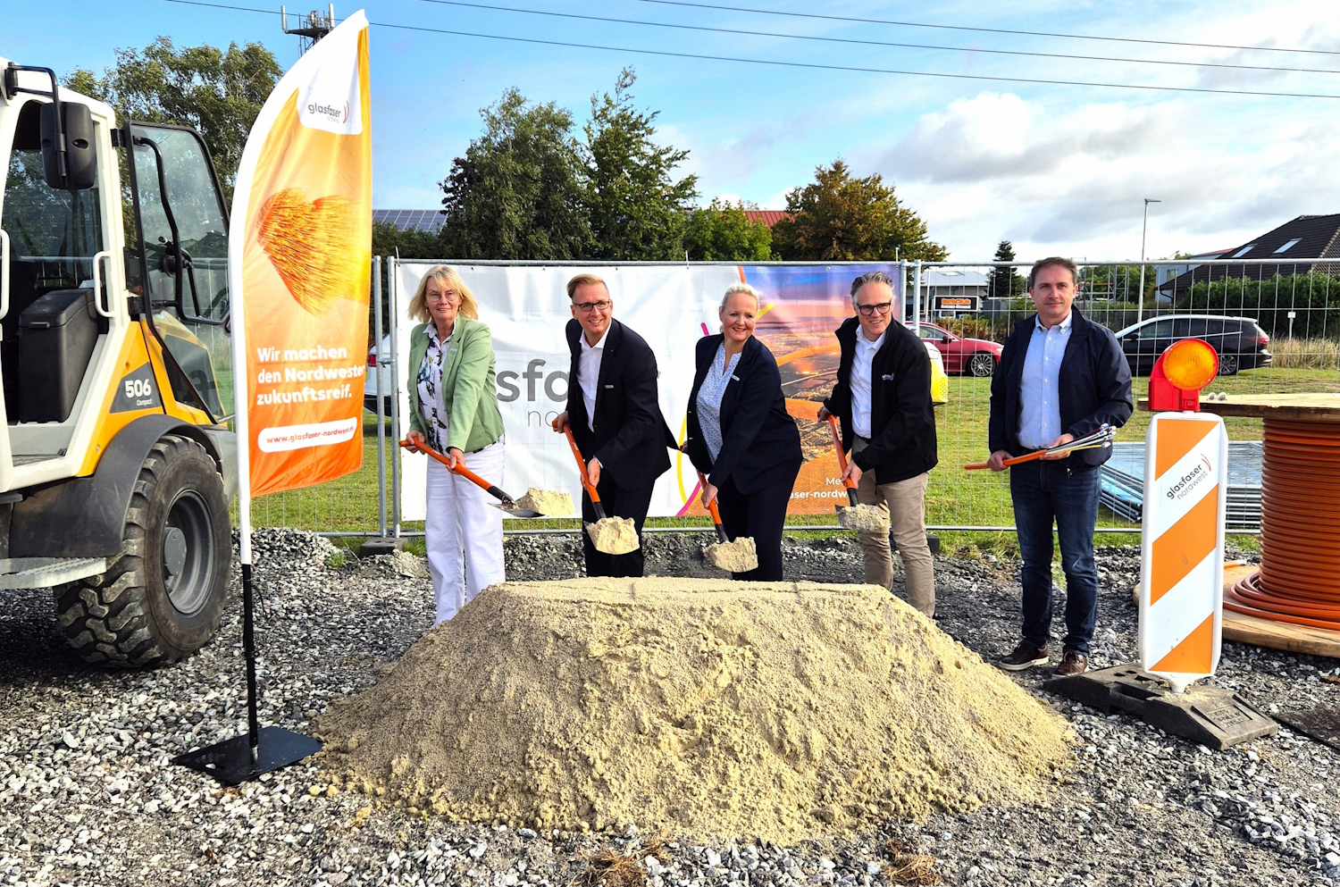 Der Glasfaserausbau in der Wesermarsch nimmt weiter Fahrt auf. Mit dem bereits angekündigten Baustart in Elsfleth und Lemwerder erschließt Glasfaser Nordwest weitere rund 6.000 Haushalte und Unternehmensstandorte. Damit wächst das Glasfasernetz in der Region kontinuierlich – ein bedeutender Schritt in Richtung flächendeckender Versorgung. Den offiziellen Startschuss für den Ausbau gaben heute der Landrat des Landkreises Wesermarsch Stephan Siefken, Andreas Mayer, Geschäftsführer der Glasfaser Nordwest, Brigitte Fuchs, Bürgermeisterin der Stadt Elsfleth, Christina Winkelmann, Bürgermeisterin der Gemeinde Lemwerder, Sascha Zink, Leiter Öffentlichkeitsarbeit und Wohnungswirtschaften bei Glasfaser Nordwest, sowie Carlos Andrade Facal, Geschäftsführer der Nord Connect, im Rahmen eines symbolischen Spatenstichs.