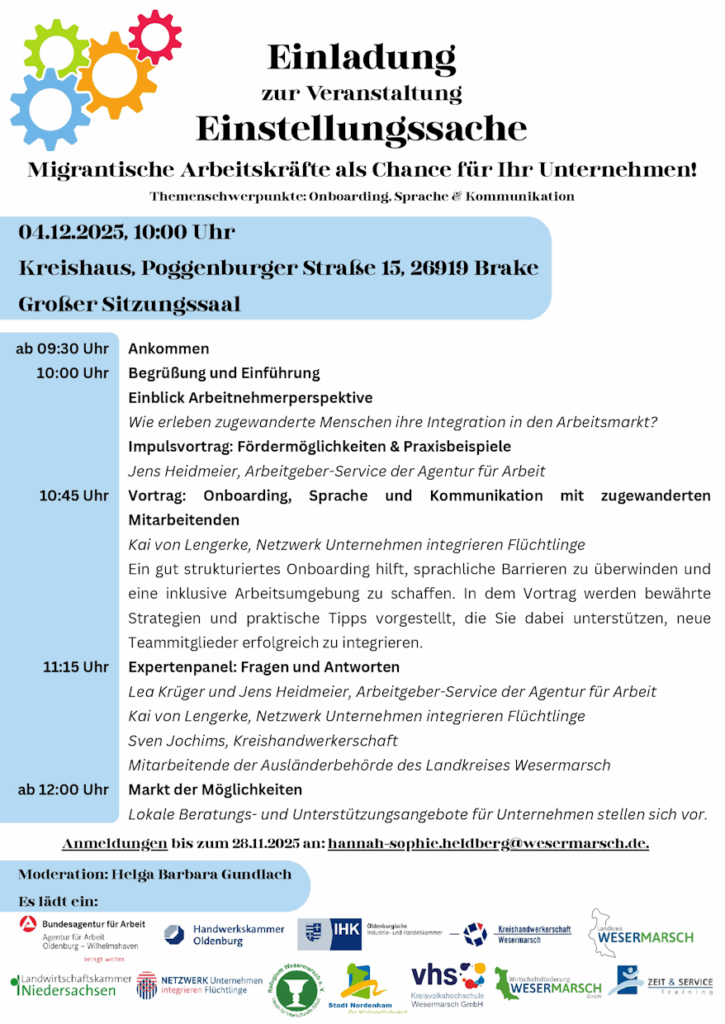 Zugewanderte Menschen sind für hiesige Unternehmen auch angesichts des sich in den kommenden Jahren verschärfenden Arbeits- und Fachkräftemangels eine große Chance, offene Stellen zu besetzen. Für den 4. Dezember 2025 lädt die Koordinierungsstelle Migration und Teilhabe des Landkreises Wesermarsch zusammen mit ihren Partnern daher zur zweiten Auflage der Veranstaltung „Einstellungssache: Migrantische Arbeitskräfte als Chance für Ihr Unternehmen“ ins Braker Kreishaus ein. Unternehmen haben in diesem Rahmen die Gelegenheit, praxisorientierte Impulse und bewährte Strategien für die Integration von zugewanderten Arbeitskräften zu erhalten und damit dem Fachkräftemangel aktiv entgegenzuwirken.