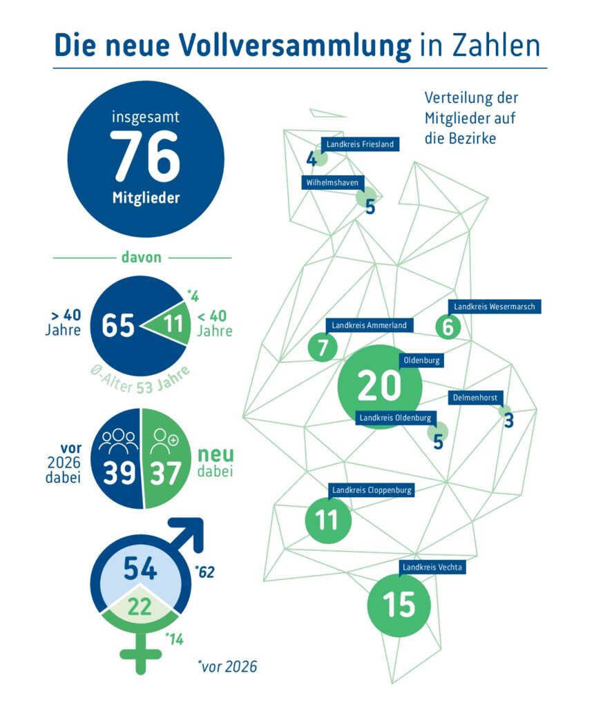 Neumitglied Kim Körber vom Klinikum Oldenburg etwa rückt Innovationen und Fachkräftegewinnung in den Fokus. „Ich möchte den Startup-Gedanken stärken und zeigen, welche Möglichkeiten Entrepreneurship bietet“, sagte wiederum Unternehmerin Alexandra Gölz von der Nature Care GmbH aus Jever. Die Delmenhorster Apothekerin Oksana Omutova möchte gemeinsam konstruktive Impulse für die Region geben. An die Herausforderungen des Strukturwandels erinnerte Familienunternehmer Tobias Krumpelbeck aus Vechta. Auch „bessere Lösungen für schwierige Themen“ finden und dabei das Netzwerk nutzen oder „ein bisschen Ärger machen, um Dinge anzuschieben“ darf in den kommenden fünf Jahren aus der Vollversammlung erwartet werden. Denn den Worten sollen nun Taten folgen. (pm/lr – Graphik: IHK Oldenburg)