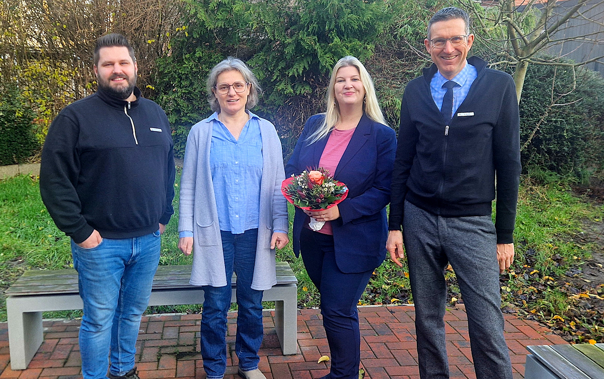 Titelfoto: Landkreis Wesermarsch/Kerstin Kleemann – Personalrat Sajoscha Bruchhausen, Fachdienstleiterin Monika Wessels und der Erste Kreisrat Matthias Wenholt danken Kerstin Krasniqi (2. v. r., mit Blumen) für 25 Jahre Arbeit für die Menschen der Region im öffentlichen Dienst.