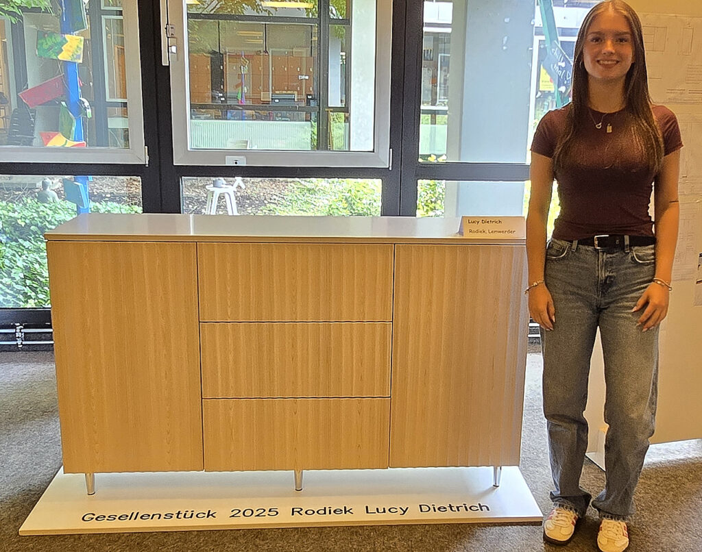 Dabei war Bjarne Janßen, 20 Jahre (Rodiek, Lemwerder), der einen halbhohen Schrank für den Flur entworfen und gebaut hat. Die Türen sind auch Eiche und auf Gärung furniert. Es flossen auch Elemente aus Nussbaum mit ein, die einen Tiefeneffekt erzeugen. Aus diesem Holz ist auch eine Schublade, die klassisch verzinkt ist, gefertigt. Mit einem kleinen Schrank in der Mitte soll eine Tiefenwahrnehmung erzeugt werden.