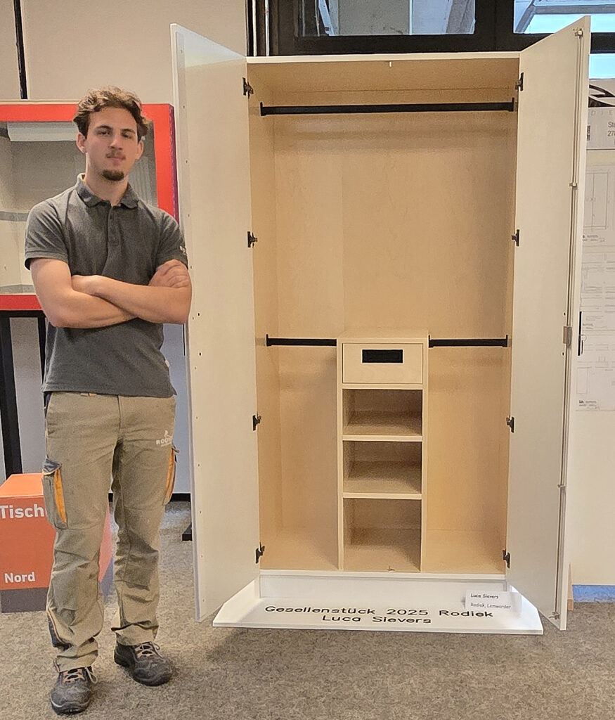 Einen zweitürigen Kleiderschrank hat der 19 Jahr alte Lucas Sievers (Rodiek, Lemwerder) entworfen. Der Schrank lässt sich leicht auseinanderbauen und hat in der Mittel ein Schubkastenelement mit extra Kleiderstangen. Das Besondere hier ist das weiße Furnier, das in Italien durchgefärbt wurde.
