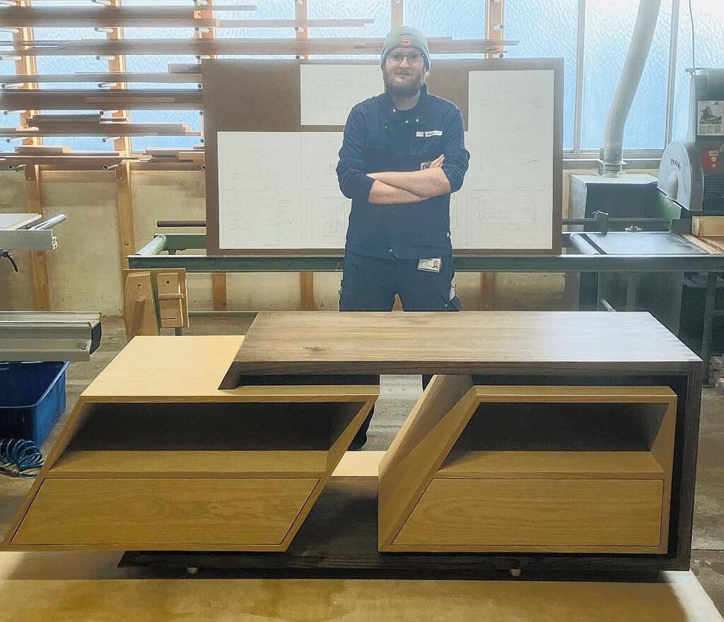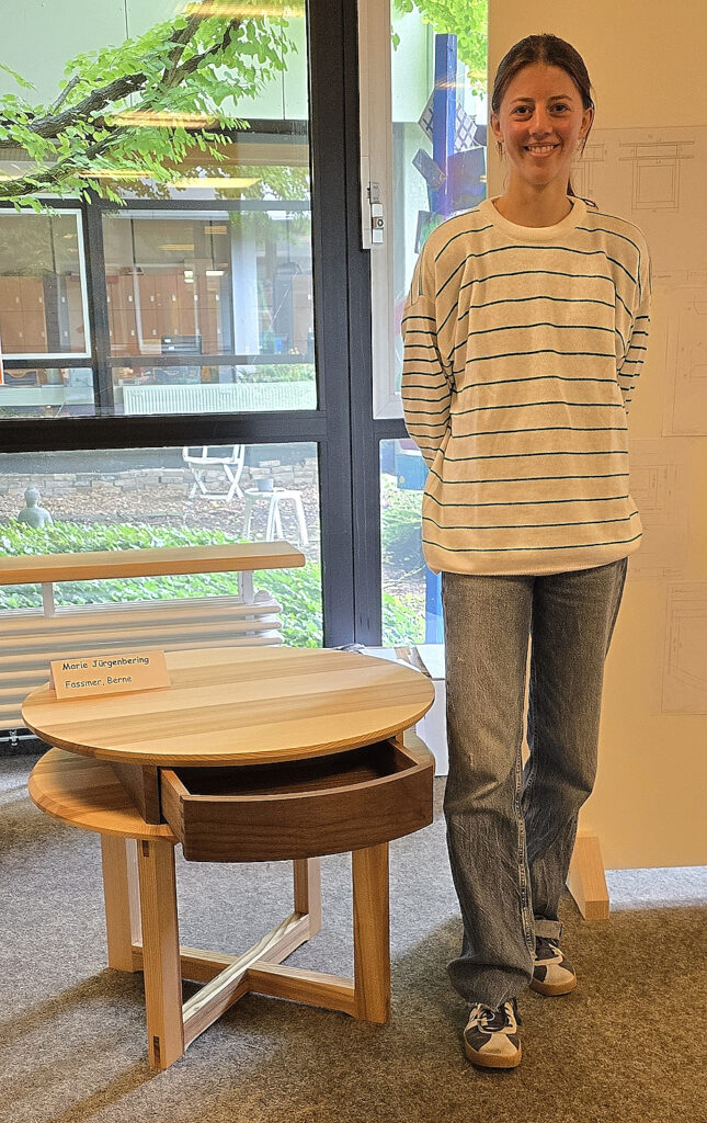Marie Jürgenbering, 22 Jahre, (Fassmer, Lemwerder), hat sich für einen runden Couchtisch entschieden. Diesen hat sie aus Vollholz Esche und Nussbaum gefertigt. Er hat ein rundes Vorderstück, in dem sich eine Schublade befindet. Das Runde hat sie auch mehreren Furnierschichten beim Leimen in die endgültige Form gepresst. Marie Jürgenbering verlässt ihren Ausbildungsbetrieb, um künftig woanders zu arbeiten.