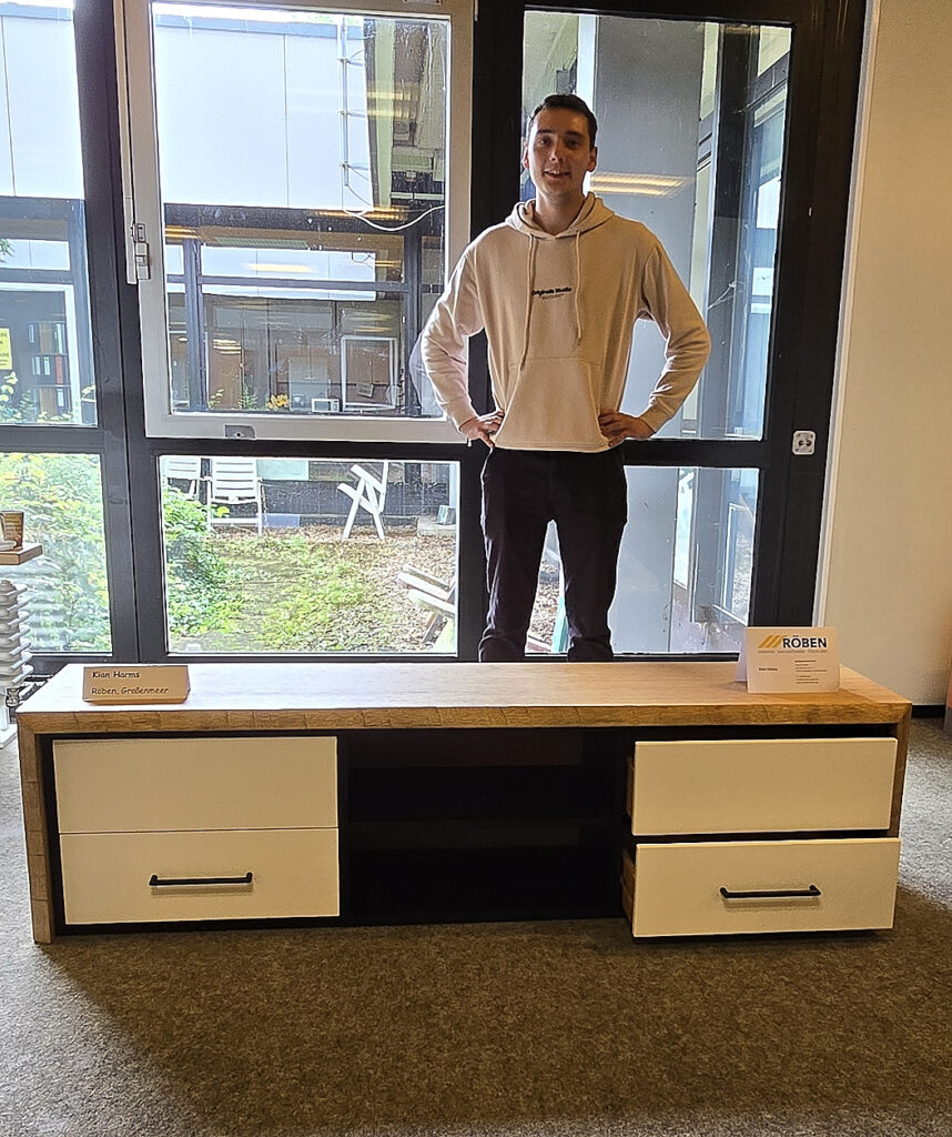 Ein Sideboard ist das Werk von Kian Harms, 20 Jahre (Röben-Großenmeer). Er hat dies aus Vollholz Eiche gefertigt und mit MDG-Platten – in Schwarz und Weiß lackiert – verkleidet. Hingucker sind hier die umlaufende Baumkante und die gebürstete Oberfläche. Das Sideboard verfügt über vier Schubladen, zwei mit Griffen und zwei im push-open-Verfahren.