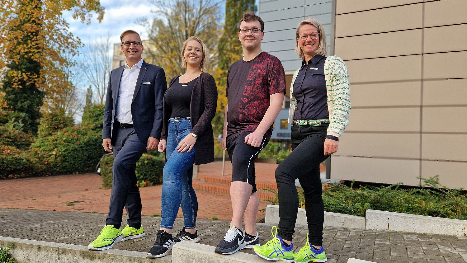 Foto: Landkreis Wesermarsch/Meister – Die Sportschuhe sind geschnürt: Stephan Siefken, Sina Hobbensiefken, Sachbearbeiter Lukasz Golowacz und Sindy Nestler werben für die Aktion „Stadt. Land. Zu Fuß.“, die am 1. November startet.